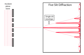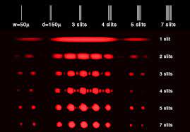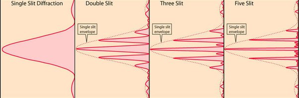With each new slit introduced, the ‘subpeaks’ within a peak become increasingly extreme relative to their minimum intensities.