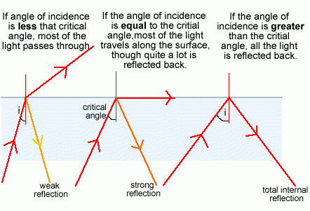The refractive index and the critical angle are related by the following equation: Total internal reflection only occurs when the light ray propagates from a optically denser medium to an optically less dense medium.
