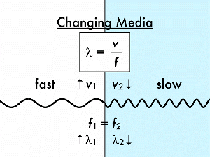 Where and are the speed of the waves in their respective mediums and and are the wavelength of the waves of their respective mediums.