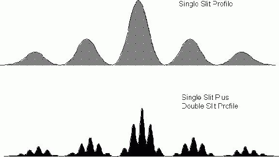 The previous section shows an ideal double-slit which ignores the single-slit characteristics of each of the two single-slits. A true double-slit would exhibit closely spaced dark and light areas (fringes) superimposed over the single-slit pattern. The single-slit profile is said to modulate the double-slit pattern.