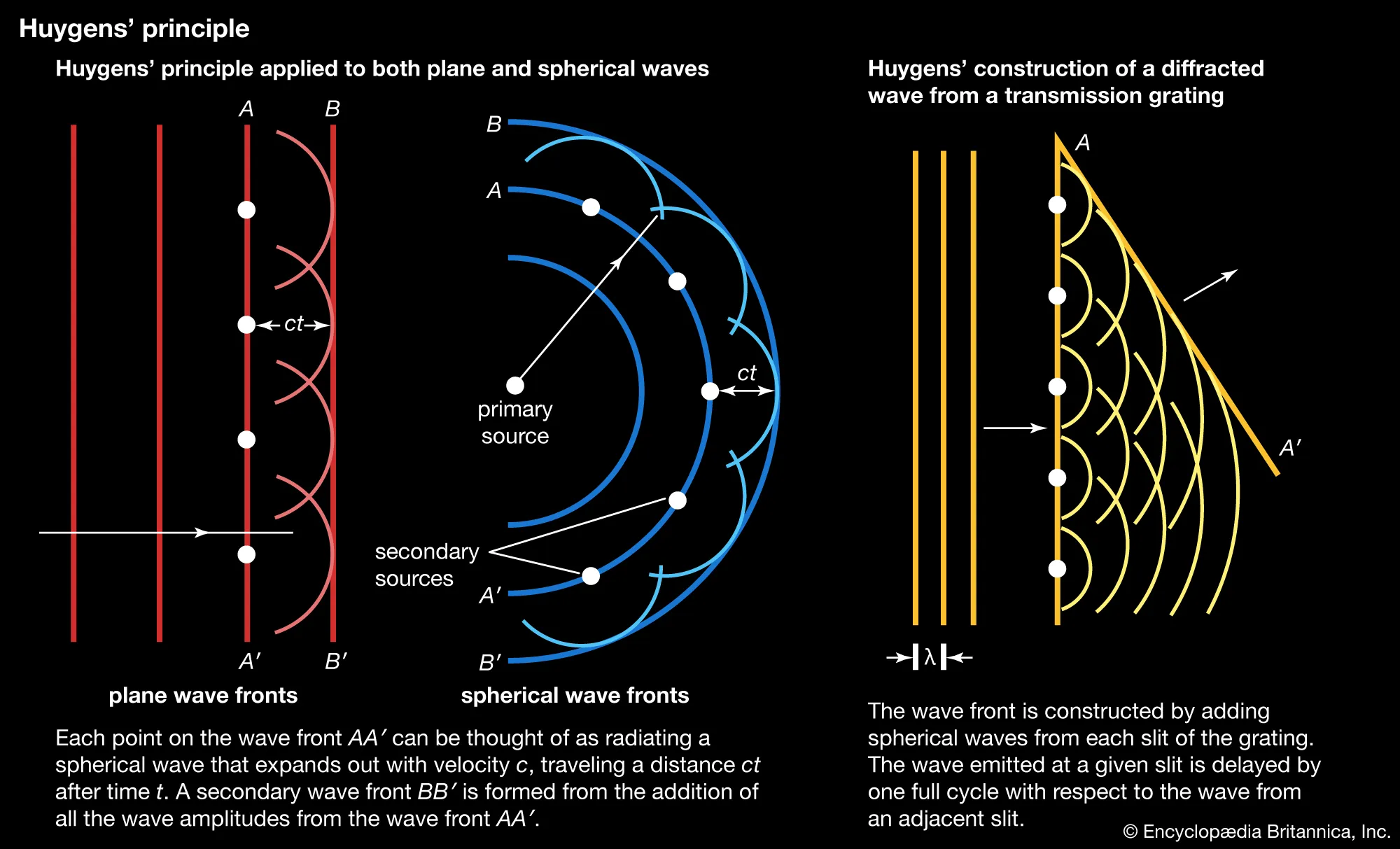 According to Huygens’ principle, every part of the wave front in the slit emits wavelets (rays that start out in phase and head in all directions, where each is perpendicular to the wave front of the wavelet.) In essence, each wave can be thought of as a line, made up of points. Each point emits a spherical ‘mini-wave’ and when it goes through a slit, it rounds out because there are no more spheres to make it straight.